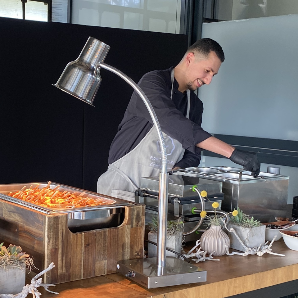 Begleitet wurde die Offsite Party von einem erfahrenen Gastgeber Team aus Service Leitern, Küchen Profis, Logistik und Veranstaltungsleitung. Gemeinsam schufen sie eine ruhige, verlässliche Struktur im Hintergrund, während die Gäste sich frei bewegen und genießen konnten. Alle Stationen und Buffets wurden im FLOW Stil inszeniert, mit warmen Elementen, schwarzen Design Regalen und klarer Linienführung.