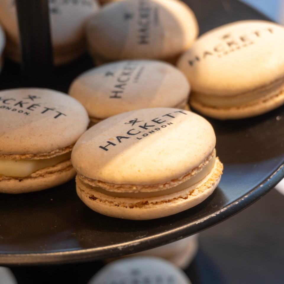 Im Mittelpunkt standen gebrandete Macarons mit individuellem Logo Druck. Mit vier Wochen Vorlauf produziert und exakt abgestimmt auf das Corporate Design, wurden sie zum Signature Moment des Abends. Ein Detail, das sofort Aufmerksamkeit erzeugte und die Marke kulinarisch übersetzte. Hackett im Wertheim Village