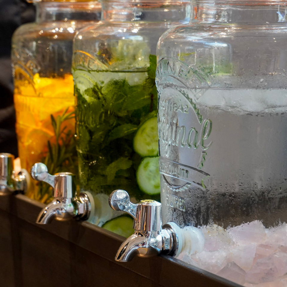 Eine FLOW Detox Wasserbar mit Rosenquarz Elementen in den Varianten Minze Gurke und Orange Rosmarin sorgte für Frische und moderne Leichtigkeit. Ein visuelles Highlight, das Gäste fotografierten und gerne probierten. Hackett im Wertheim Village